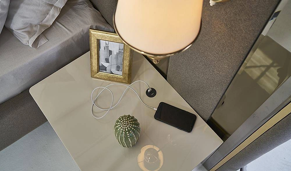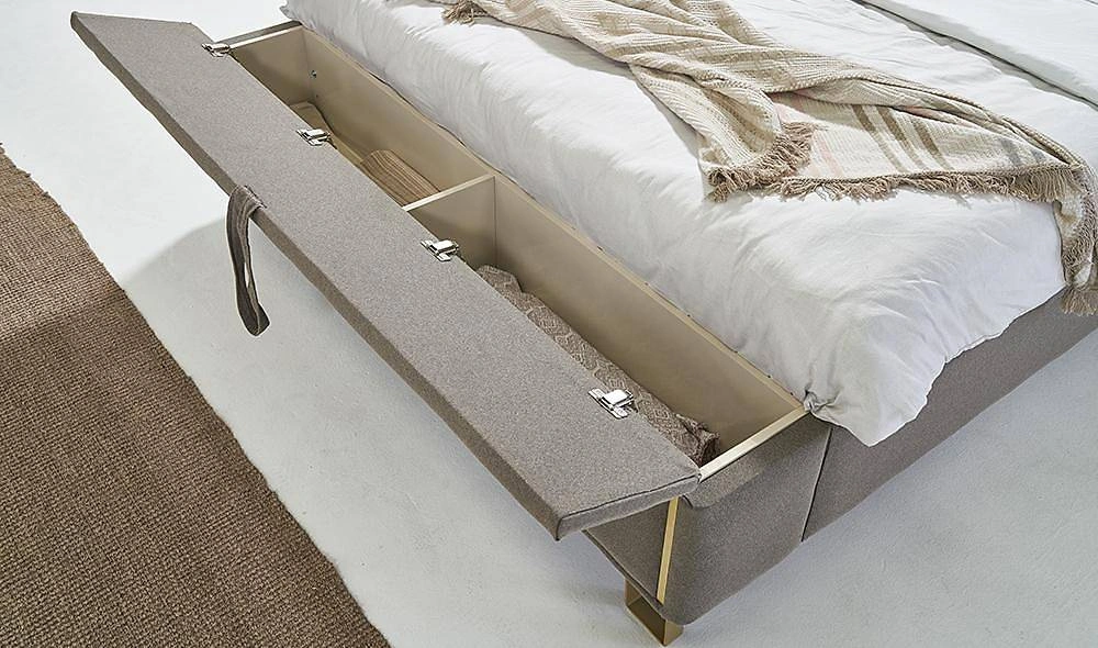 أما السرير، فهو بتصميم فخم مع تنجيد قطيفة ناعمة بلون فانيلا لاتيه يضفي شعورًا بالدفء والرقي. كما يأتي الدولاب بتصميم حرف L دريسنج الذكي الذي يوفر أقصى مساحة تخزين ممكنة بطريقة منظمة وعملية.